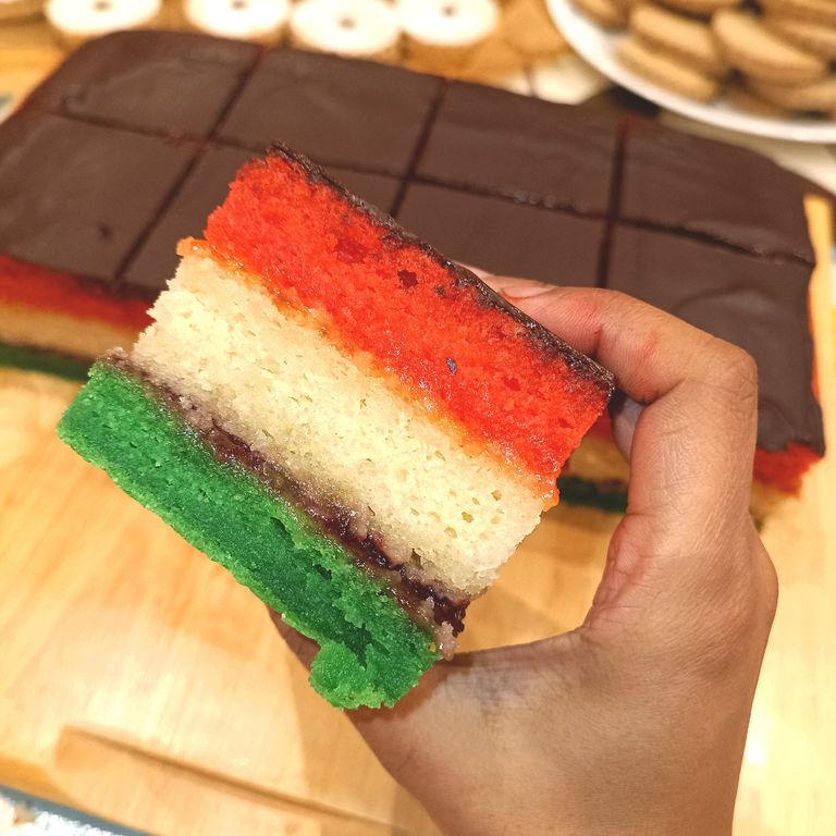 This Venetian cake is traditionally eaten at Christmas time. Representing the colours of Christmas and the Italian flag colours. Consisting of almond sponge layers sandwiched together with apricot jam and raspberry jam, then topped off with chocolate.